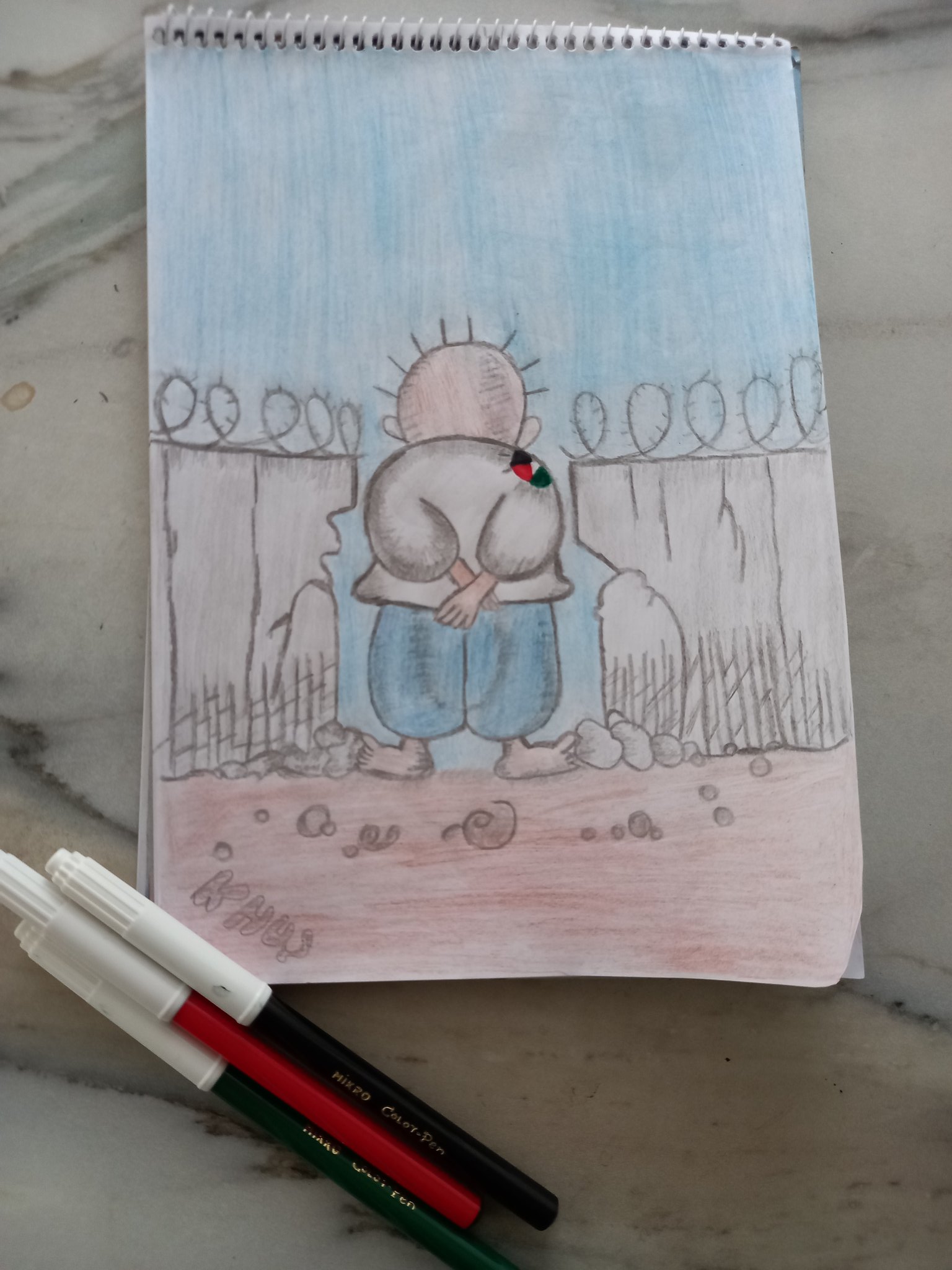 Whilst drawing “Handala”, the powerful image of resistance was created in 1969 by a Palestinian political cartoonist Naji al-Ali, who was born in 1937 in al-Shajara, a small Palestinian village in the Galilee. In May 1948, Ali’s village was destroyed by Zionist forces, and its 893 residents were exiled. A huge number of Semitic Palestinians were murdered with impunity and those who survived were forced into exile. Naji al-Ali was only 10 years old, and saw himself in Handala, a child with tattered clothes, no shoes, and messy hairs, with his hands behind his back, patiently waiting to go home. Sadly, Naji al-Ali was shot on August 22, 1987, outside the London office of al-Qabas, the Kuwaiti newspaper that he worked for. But Like Palestinians so beautifully says “Resistance is existence “, the resistance never stopped, it’s a promise that every generation of Palestinians will fulfill, it’s part of their blood, the love of their land, their history and culture, Naji never returned to his homeland, but he’s still alive and living in Handala, this image is not only keeping his message alive but the promise of every single Palestinian living in diaspora.