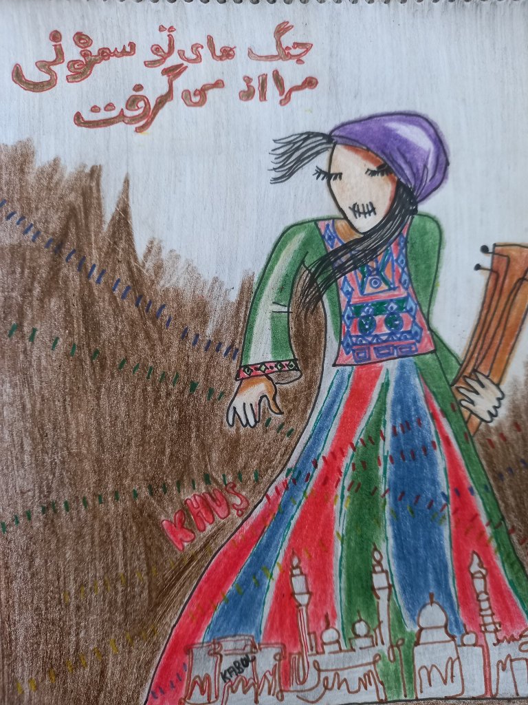 Some details about this art , the idea is taken from an Afghan graffiti artist ,Shamsia Hassani, who’s using her art to record her protest in a war torn, Male dominated society, depriving the women of their basic rights of education and living freely .Although I have made huge changes in her original idea , for example, the sealed lips are portraying her silence, the colours of her dress are carefully chosen according to the traditional style and colours of the Afghan culture, as the Afghan loves green , red ,blue and bright colours, the design on the upper body of the dress is showing the embroidery the Afghan dresses are famous for, and at the bottom of the dress is an humble effort to make a connection to the symbol of Kabul, the minarets of the mosque, the girl is holding an instrument but there’s no music,as her lips are sealed , so the caption above was something of an inspiration “جنگ های تو سمفونی مرا از من گرفت ” , meaning “your wars took my symphony away from me”.