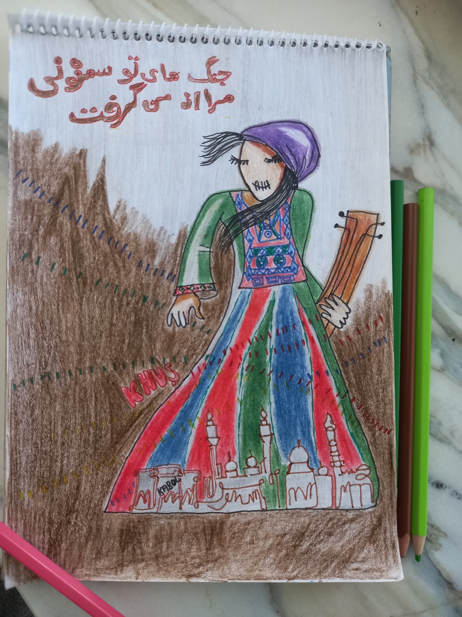 Some details about this art , the idea is taken from an Afghan graffiti artist ,Shamsia Hassani, who’s using her art to record her protest in a war torn, Male dominated society, depriving the women of their basic rights of education and living freely .Although I have made huge changes in her original idea , for example, the sealed lips are portraying her silence, the colours of her dress are carefully chosen according to the traditional style and colours of the Afghan culture, as the Afghan loves green , red ,blue and bright colours, the design on the upper body of the dress is showing the embroidery the Afghan dresses are famous for, and at the bottom of the dress is an humble effort to make a connection to the symbol of Kabul, the minarets of the mosque, the girl is holding an instrument but there’s no music,as her lips are sealed , so the caption above was something of an inspiration “جنگ های تو سمفونی مرا از من گرفت ” , meaning “your wars took my symphony away from me”.