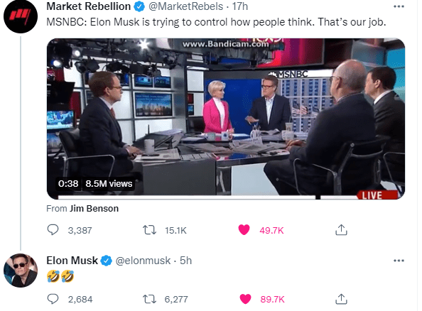 Jim Morrison said, ” whoever controls the media, controls the minds ” that’s one hundred percent true in todays time, so when you hear a comment like “Elon Musk is trying to control how people think, that’s our job” on MSNBC , you feel like the cat took your tongue .Their blunt conformity is alarming, admitting the mind controlling tactics of media.