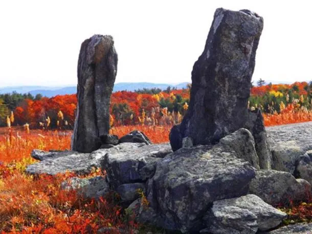 American Stonehenge which is about 30 miles to the NW in New Hampshire and has astronomical alignments has been carbon-dated to around 4,000 years ago and the builders of American Stonehenge are still unknown. The standing stones on Burnt Hill seem to be much older, they are crudely propped and placed instead of intricate stonework as we see at American Stonehenge. Some of the stones on Burnt Hill looked shaped, but this site has never been properly investigated.